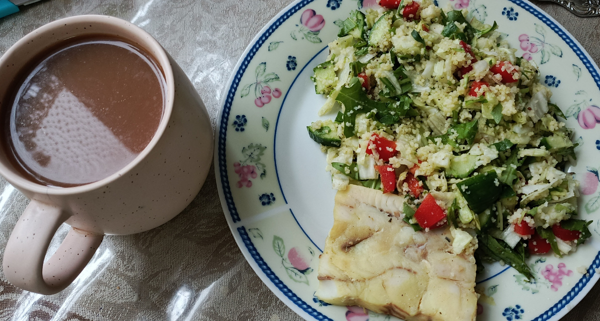 Завтрак: салат с кус-кусом и филе минтая, кофе с кокосовым молоком