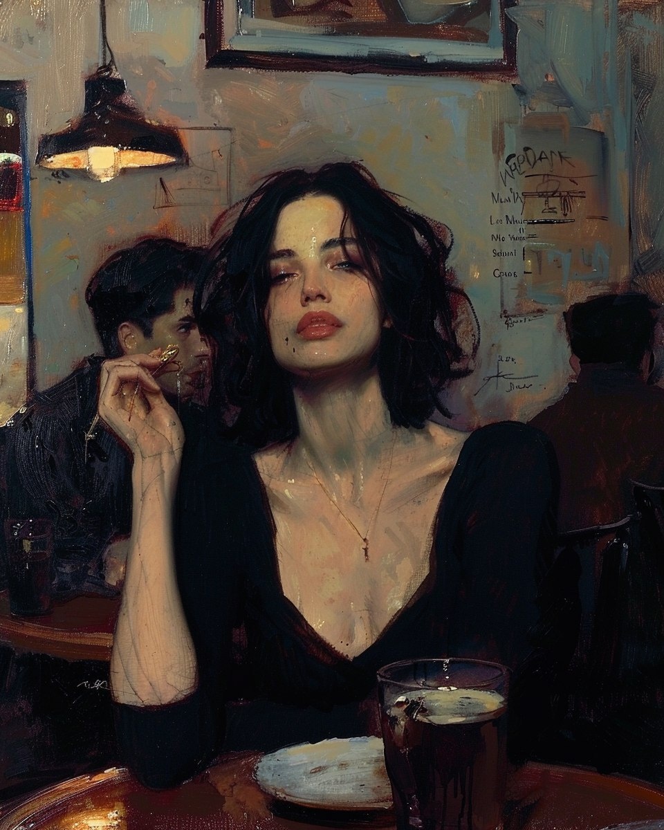 Создано на основе запроса: Oil painting people in a cafe, dark and seedy, depression era, with facial details, dramatic light and shadows, golden ratio masterpiece, in the style of Malcolm T. Liepke --- Автоперевод: Масляные рисовать люди в кафе, темная и заходом, эпоха депрессии, с деталями лица, драматическим светом и тени, шедевр золотого соотношения, в стиле Малкольма Т. Липке Хорошо получилось? 🤔 https://dzen.ru/id/65c0c65c86e4f837c27b24d7 #ИИ #AI #нейросеть #midjourney #art