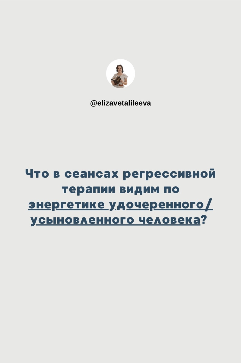 Что мы видим по энергетике удочеренного/усыновленного человека в сеансах регрессивной терапии? Есть наш с вами уровень социальных отношений — человеческий. В нем пара или иногда один человек усыновляет или удочеряет ребенка по разным причинам: ➡️ не могут по причинам здоровья завести своего родного ребенка; ➡️ не могут завести ребенка желаемого пола; например, одна моя клиентка, мама четверых мальчиков, удочерила девочку; ➡️ испытывают потребность помочь, дать тепло и любовь детям, при этом своего по разным причинам рожать не хотят; ➡️ удочеряют или усыновляют ребенка родственников, если с его родителями произошло несчастье и т.д… Причин много, по которым люди принимают такое решение. Я со своей стороны не беру на себя ответственность призывать или отговаривать от усыновления/удочерения. Я могу только описать то, что мы видим в сеансах регрессивной терапии, когда ведомый — усыновленный/удочеренный ребенок у одного или обоих родителей: ➖ Мы видим порабощение души такого человека з