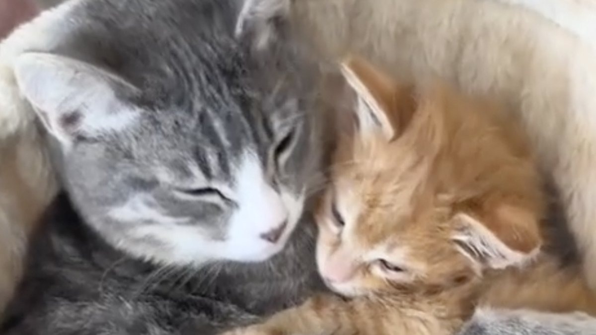 Опекунша, принявшая Пеппера на временное содержание, рассказала, что малыш не мог перестать дрожать, пока не встретил Поппи. Едва увидев взрослую кошку, кроха без страха подбежал к ней, а она начала вылизывать малыша. Складывалось впечатление, что эти двое — разлученные мать и дитя.
