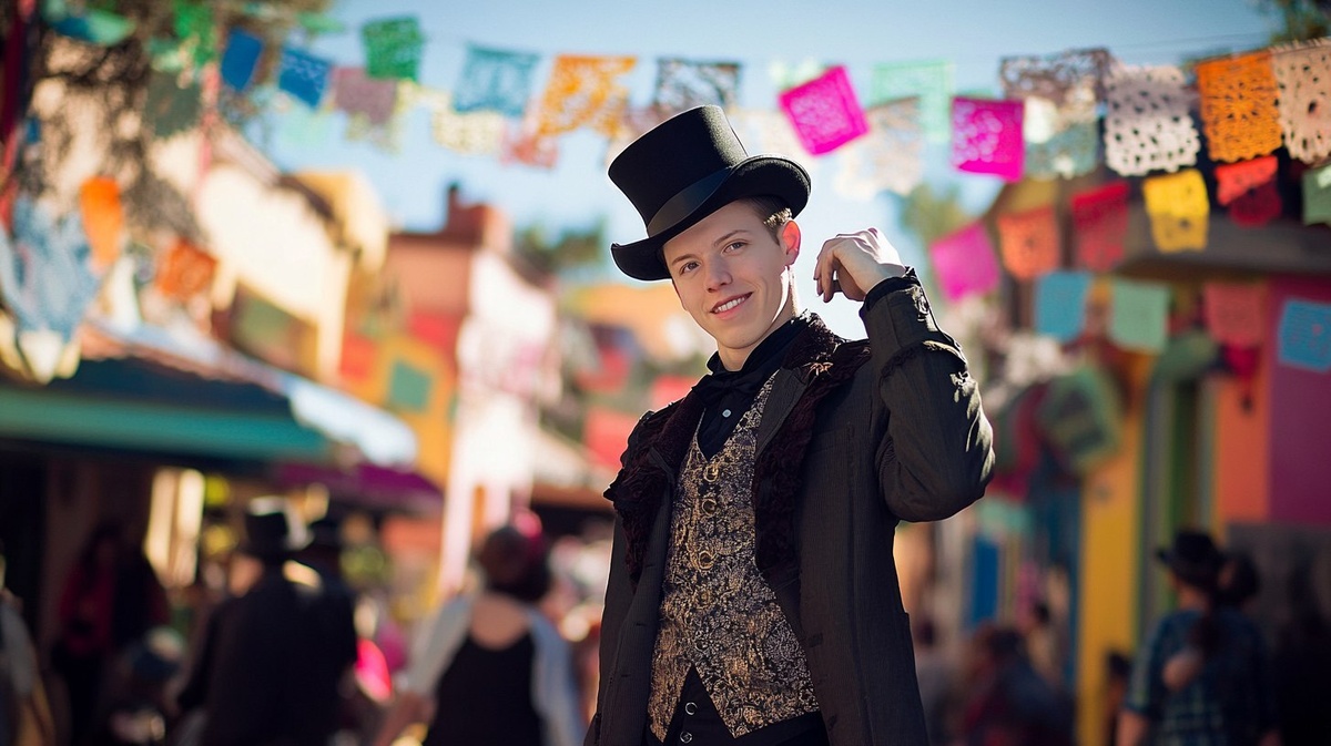 Создано на основе запроса: A photograph of a handsome young white man wearing an old victorian suit, holding his tophat and smiling rakishly. He is standing on a vibrant street scene in a fantasy city filled with colorful papel picado hanging above, colonial architecture, artisan shops, people walking and enjoying a sunny day, festive and steampunk cultural vibe, vivid colors, shallow depth of field . The photo was taken on iPhone, in casual.