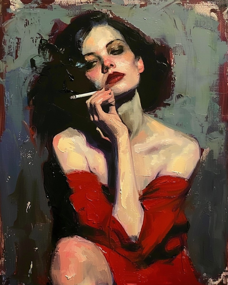 Создано на основе запроса: Oil painting a beautiful woman in red, holding cigarette, depression era, with facial details, dramatic light and shadows, golden ratio masterpiece, in the style of Malcolm T. Liepke --- Автоперевод: Масляная живопись Красивая женщина в красном, держащая сигарету, эпоху депрессии, с деталями лица, драматическим светом и тени, шедевр с золотым соотношением, в стиле Малкольма Т. Липке Как тебе такой вариант? 🤔 https://dzen.ru/id/65c0c65c86e4f837c27b24d7 #ИИ #AI #нейросеть #midjourney #art