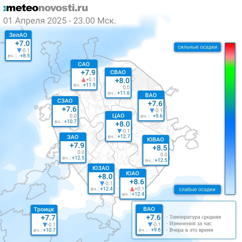 В 23:00 в Москве было от +6.8°C до +9°C, средняя температура +7.9°C #погода #Москва #весна #температура #1апреля #вторник