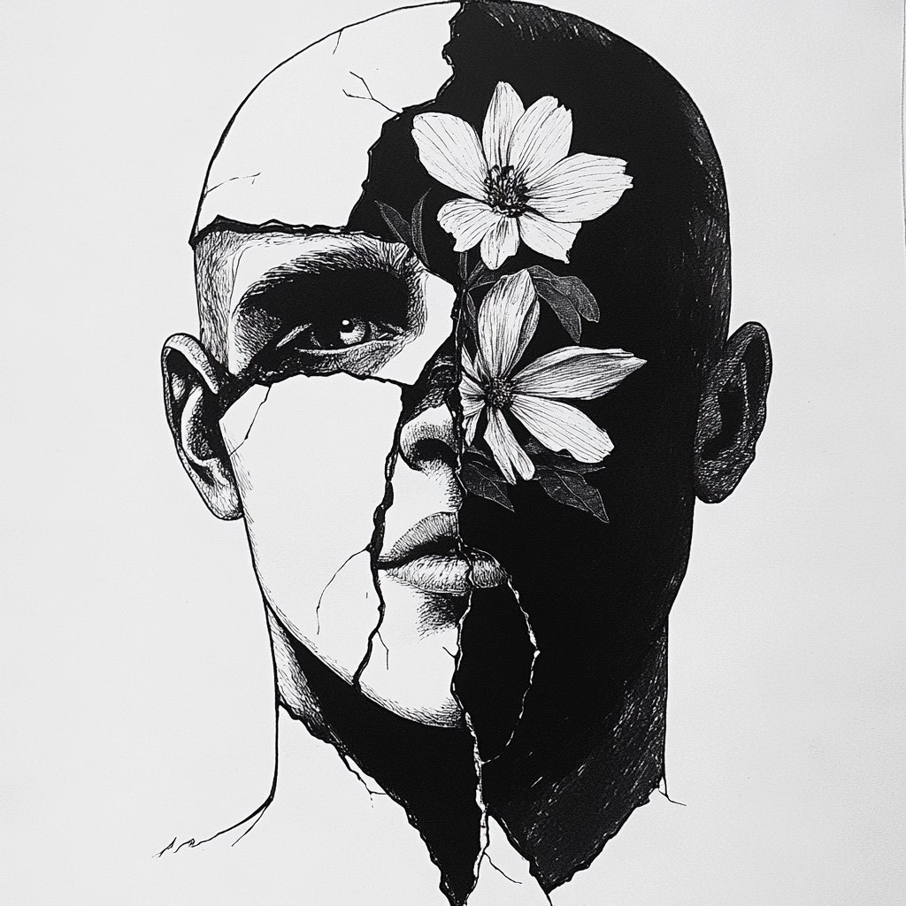 Создано на основе запроса: male head broken up and a flower is growing inside, surrealistic style, surrealism, black and white, high