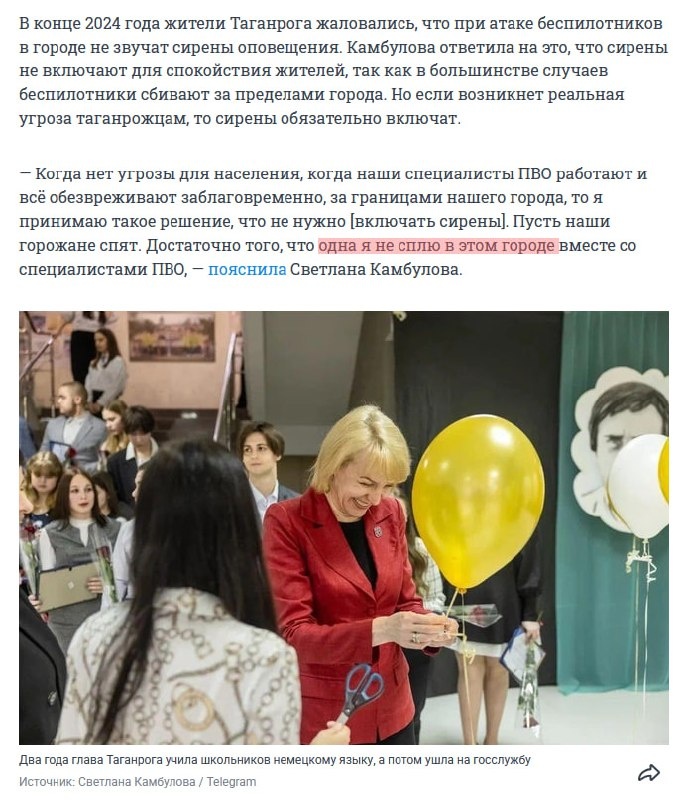 Да, похоже, что глава города не поверила в сообщение о беспилотной угрозе в связи с 1 апреля. Однако нам вспомнилась та самая загадочная PR-публикация в издании «161.ru», где Светлана Камболова заявляет о своей чрезвычайной бдительности в моменты, когда городу может угрожать опасность. Оставим эту выдержку из публикации здесь.