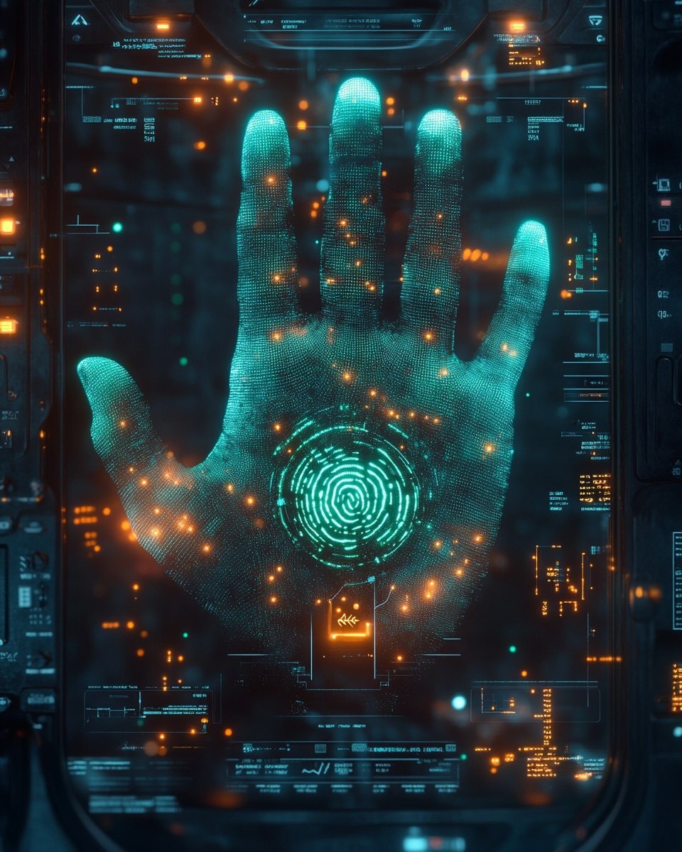 Создано на основе запроса: Cyberpunk biometric scan interface, glowing neon palmprint isolated on black background, no hand visible, fingerprint and skin texture illuminated in green, cyan, and white tones, surrounded by digital scanning lines, circular data graphs, tech diagrams, futuristic readouts, barcodes, anatomical labels, and biometric analysis text, high-tech HUD design, clean geometric layout, sci-fi medical scanner aesthetic, dominant colors: black, white, green, brown, ultra-detailed, crisp digital interface, top-down flat perspective --- Автоперевод: Размещение раздела биометрического сканирования, светящиеся неоновые пальмы, изолированные на черном фоне, без видения рук, отпечатка пальца и текстуры кожи, освещенные зелеными, голубыми и белыми тонами, окруженными цифровыми линиями сканирования, графами циркулярных данных, технологическими диаграммами. Круто выглядит? 🤔 https://dzen.ru/id/65c0c65c86e4f837c27b24d7 #ИИ #AI #нейросеть #midjourney #art