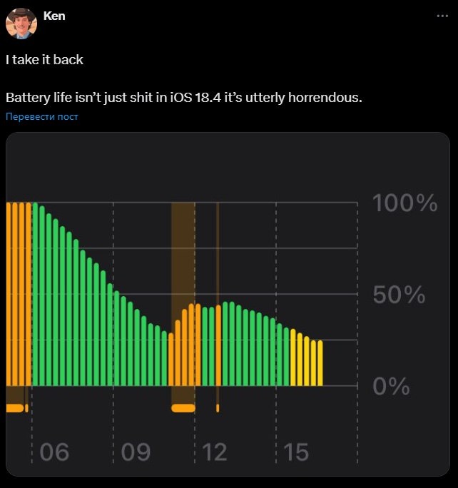 ⚠️❗️Владельцы iPhone, остерегайтесь обновления — новая iOS негативно сказывается на аккумуляторе Пользователи сообщают, что после перехода на iOS 18.4 их аккумуляторы начали разряжаться значительно быстрее. Некоторые вынуждены заряжать свои устройства до трех раз в день, а у других ёмкость батареи упала с 87% до 79%. Делитесь этой информацией с другими владельцами iPhone и избегайте обновления сами. @chilhub