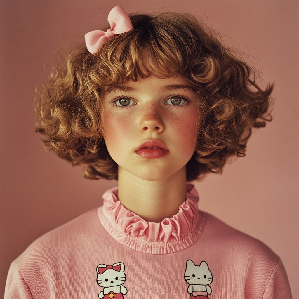 Создано на основе запроса: white girl with big forehead and head and curly hair wearing pink clothes with hello kitty