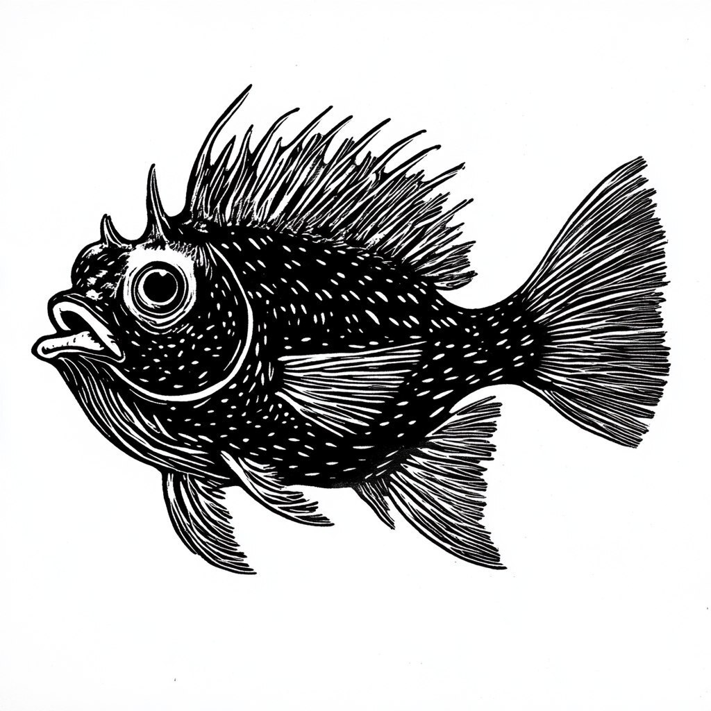 Создано на основе запроса: linocut black and white sophisticated elegant puffer fish