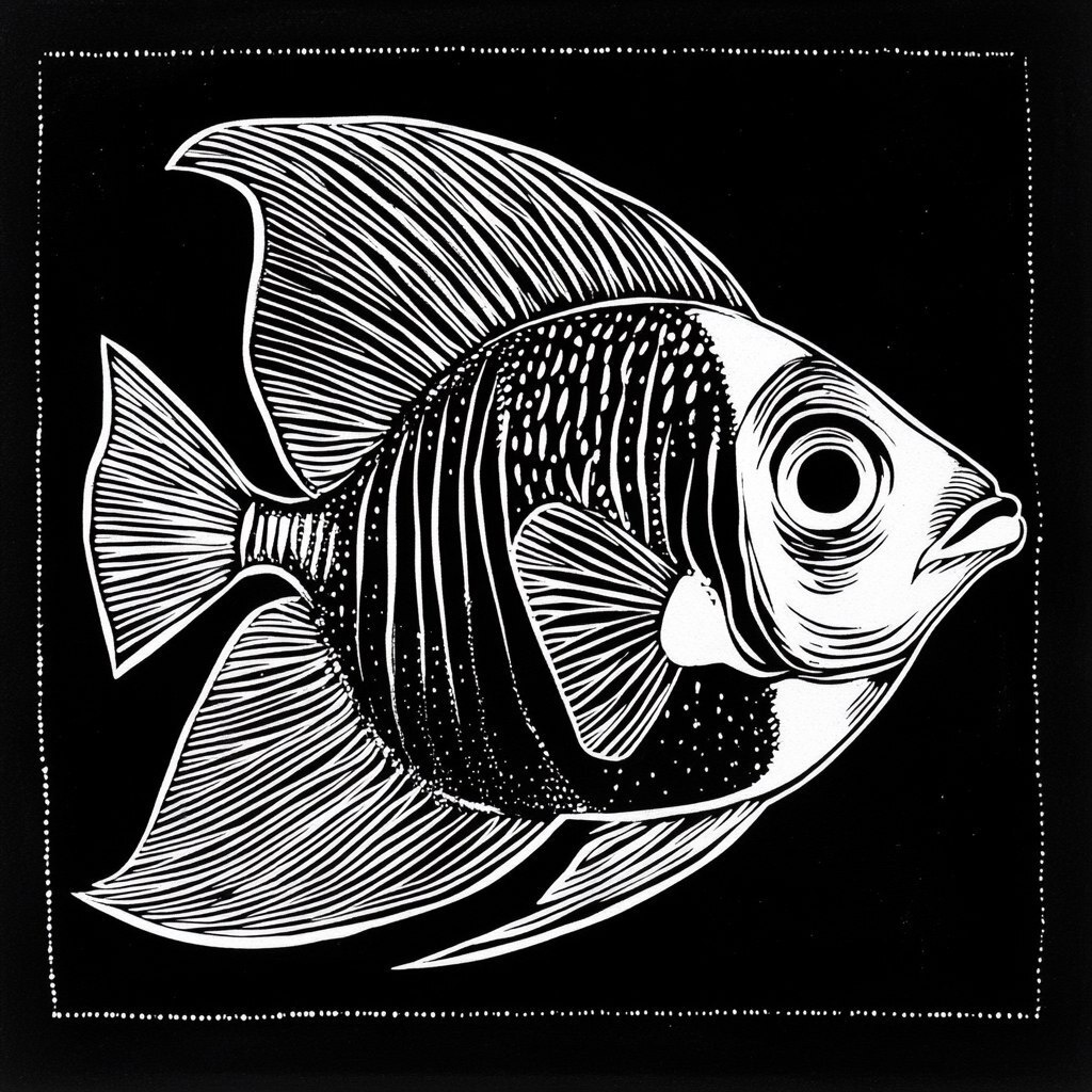Создано на основе запроса: linocut black and white sophisticated elegant regal tang fish