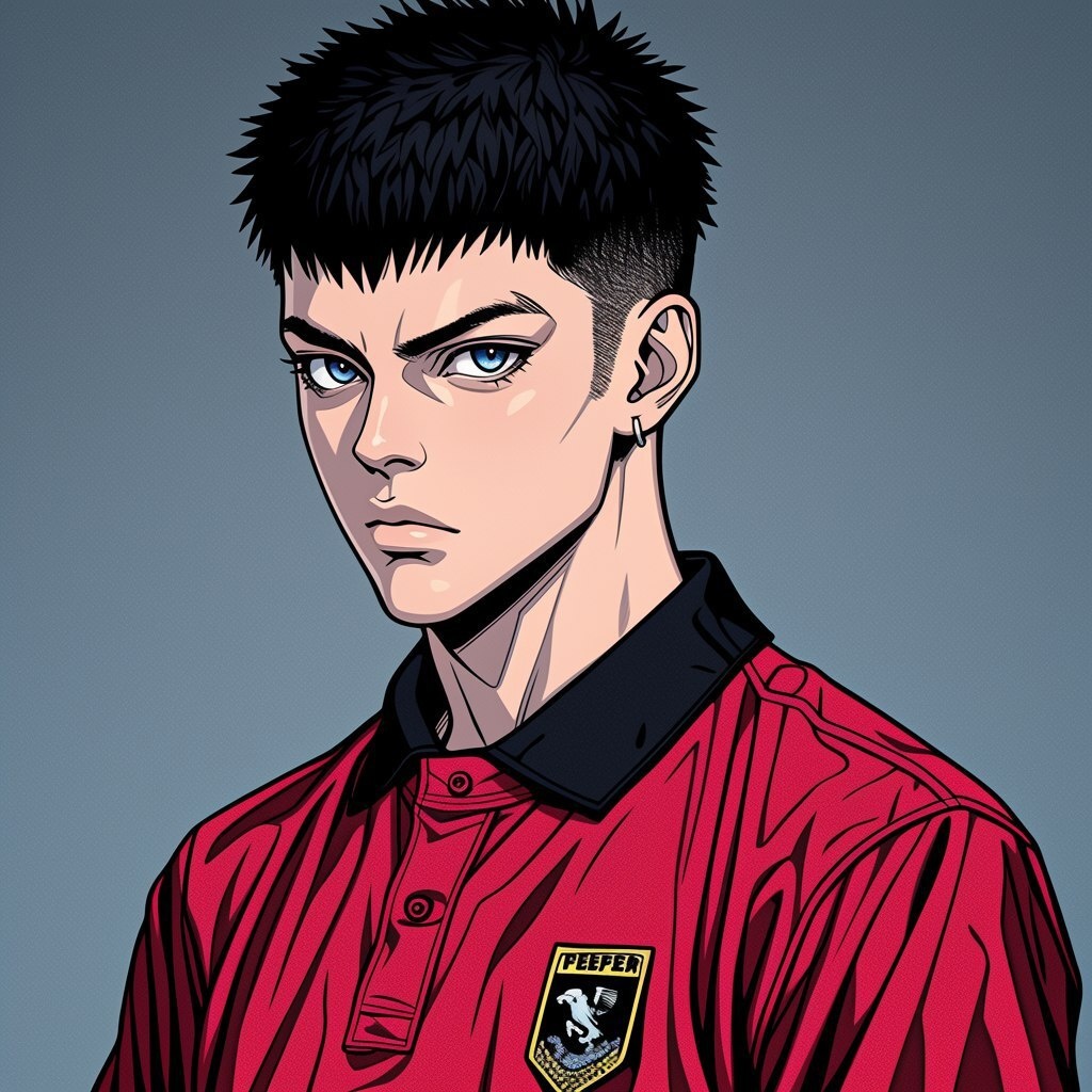 Создано на основе запроса: Side profile portrait of a young man in anime style, wearing a fitted red Fred Perry polo shirt with black