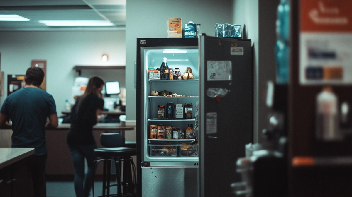 Создано на основе запроса: A shared refrigerator in a public break room, realistic photo style. The fridge is slightly messy, with some food stains and cluttered items inside. A few people are using it, one opening the fridge, another waiting nearby. The atmosphere is casual but not very clean, showing mild neglect. Documentary photography style, natural lighting, 35mm lens, candid shot, style photographic