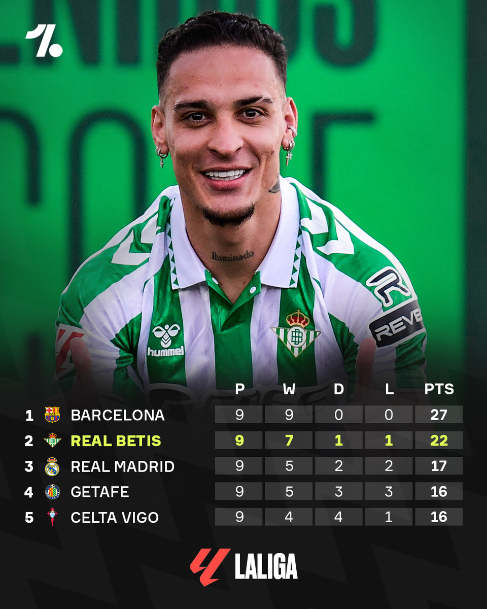 Портал OneFootball составил альтернативную таблицу испанского первенства: в нее включены девять туров Ла Лиги с момента перехода Антони в «Бетис», бразилец принял участие в восьми матчах, в самом первом туре после переезда в Испанию он не сыграл.