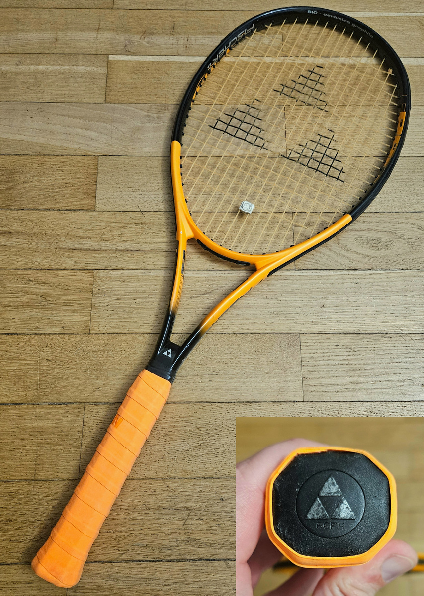 Ракетка идёт в комплекте с аутентичным чехлом и в полностью аутентичной комплектации - изначальные струны Fischer и культовый виброгаситель Fischer: