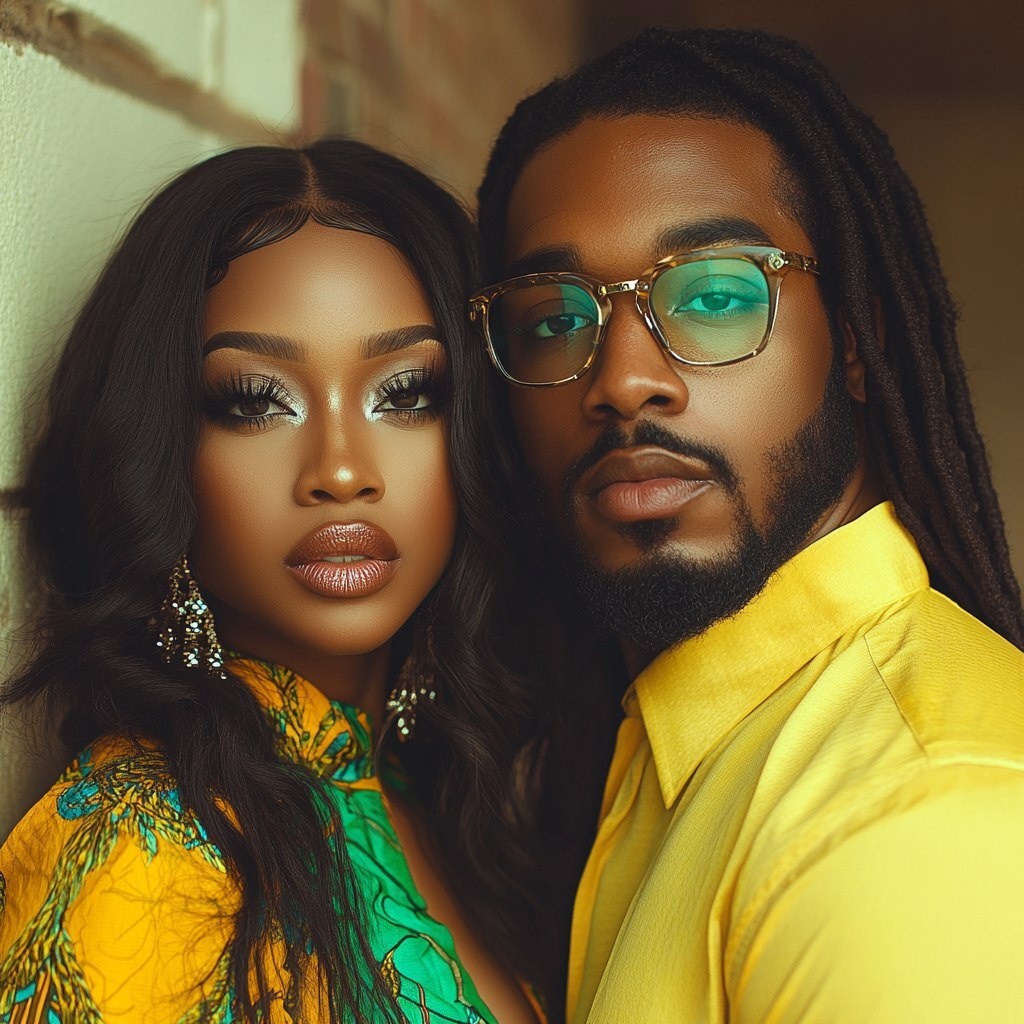 Создано на основе запроса: create an African American couple dressed in yellow and green for a photo shoot. The woman has long wavy hair with glamorous make up. The man has a long dreads. He has on eyeglasses. The picture is in professional mode with natural lighting. 8k