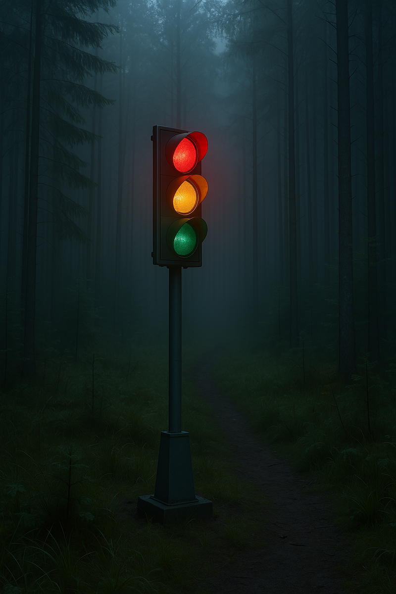 Архангельская область, 31 марта 2025 года, 22:43. В нескольких километрах от деревни Луковецкий Бор, прямо в глубине соснового леса, где нет ни дорог, ни построек, ни даже мобильной связи, был замечен… работающий светофор. Обычный трёхсекционный светофор, как на городском перекрёстке, со сменяющимися сигналами — красным, жёлтым и зелёным — стоял посреди протоптанной лесной тропы, окружённый тишиной, туманом и полным отсутствием логики. Первым его заметил местный житель — охотник Виктор Алексеевич, который возвращался из леса ночью. «Я иду с ружьём, фонарик мигает, и вдруг в темноте вижу — красный свет, мигает. Подумал, костёр или что-то загорелось. А подхожу — стоит железная стойка, как в городе. Рядом ни опор, ни кабелей, ничего — просто светофор. И работает.» Что это вообще такое? Сначала местные подумали, что это чья-то шутка или арт-объект. Однако при ближайшем рассмотрении стало понятно: устройство настоящее, с полноценным сигнальным блоком, светодиодами и автоматическим пер