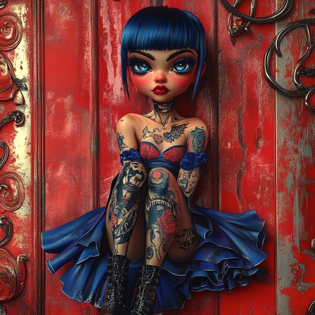 Создано на основе запроса: Futuristic digital highly detailed full-cartoon image of a high fashion brats doll with a Betty boop haircut and rich ink painted tattoos. Her hair is short deep blue colored with black hues, eyes are big and vibrant blue with long, back eyelashes, sitting against a metal red wall among metallic art deco styled decors. She is wearing a striking vibrant red and blue knee-length sleeves dress with ruffled at the bottom and high ankle and high heeled black faux leather boots. Aesthetic, high quality, detailed, 16k