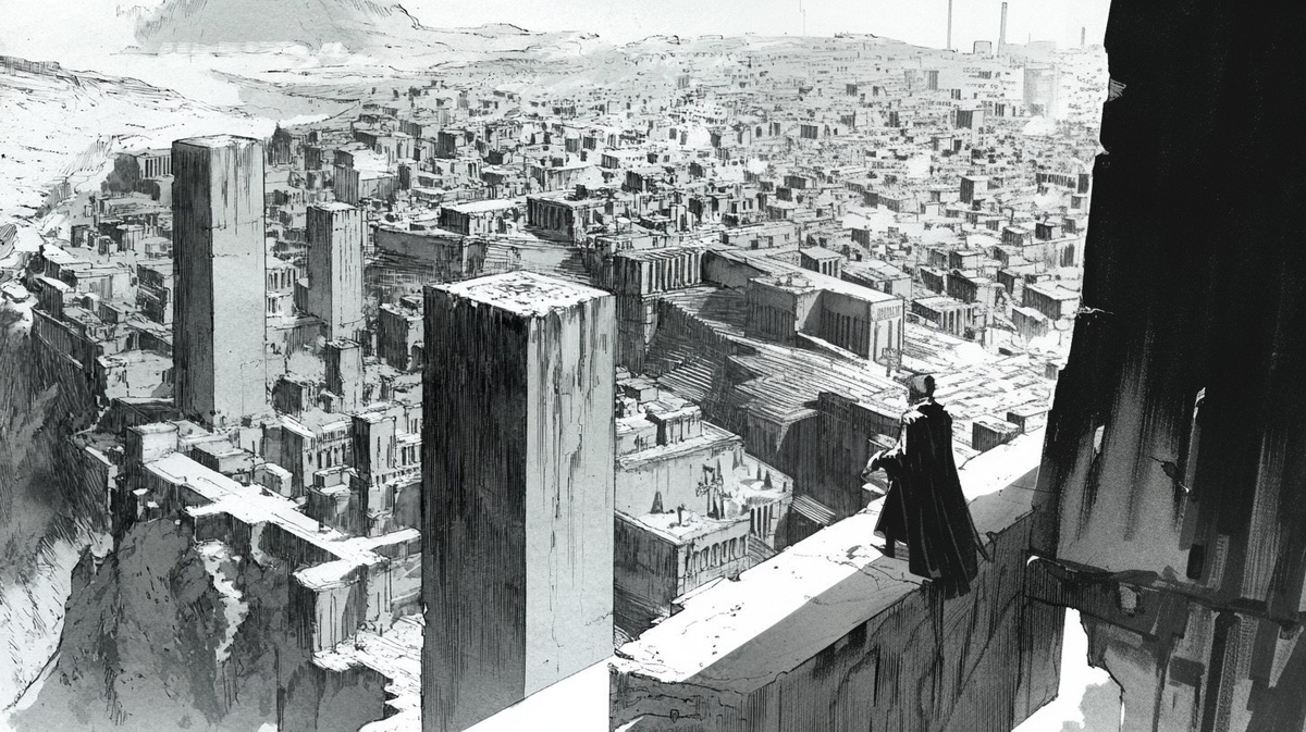 Создано на основе запроса: Illustration, high-angle, aerial perspective, map, light-green, brutalist, futuristic structures, surrounding the structures lies an ancient medieval cityscape. Both structures and city enclosed by angular concrete walls. Large-scale city map, geometric, ancient, architectural, futuristic, pale greenish-beige, buildings in the style of a distant planet or alien world, calm, peaceful mood, distant landmasses barely visible in the background, low light, overcast, dramatic lighting, no harsh shadows, brutalist, medieval, cold, mysterious, highly detailed,