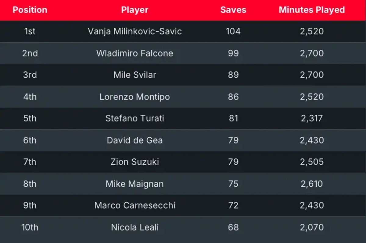 Он также возглавляет список лидеров Серии А по количеству сейвов, имея на своем счету впечатляющие 104 спасения.