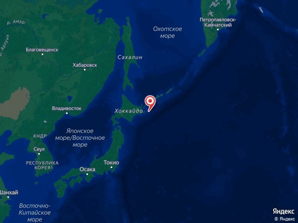 В 58 км к югу от Шикотана, Россия.