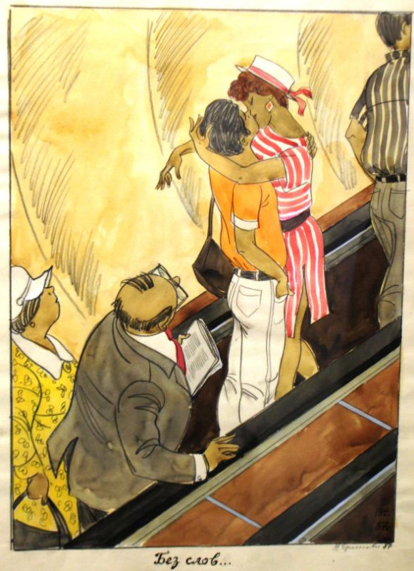 1. За публичные поцелуи. 1987. Первоначально автор поставил к своему рисунку лаконичную подпись «Без слов... (На эскалаторе)». Потом рисунок был включён в серию плакатов «Что за поведение!» и дополнен стихами.