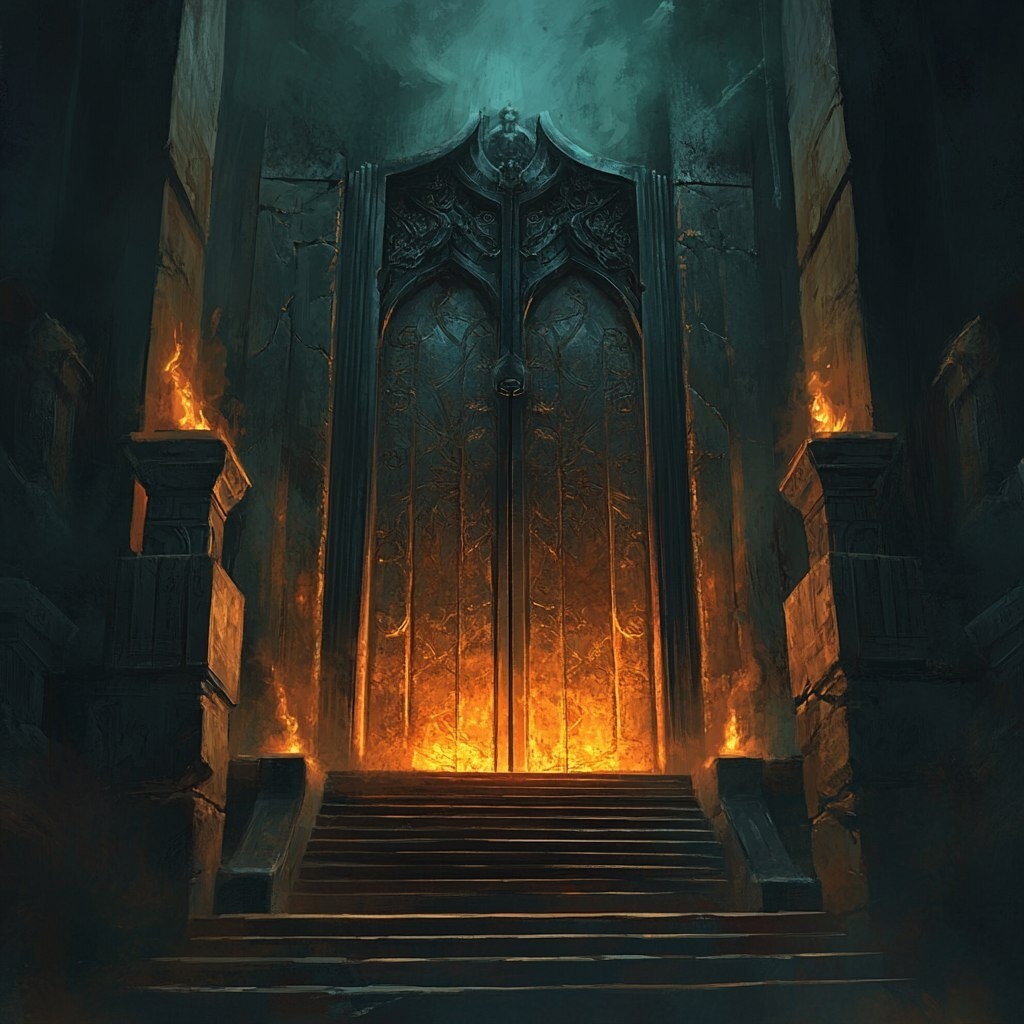 Создано на основе запроса: a large set of metal door at the top of a flight of stairs in a temple, lit by some arcane brazier