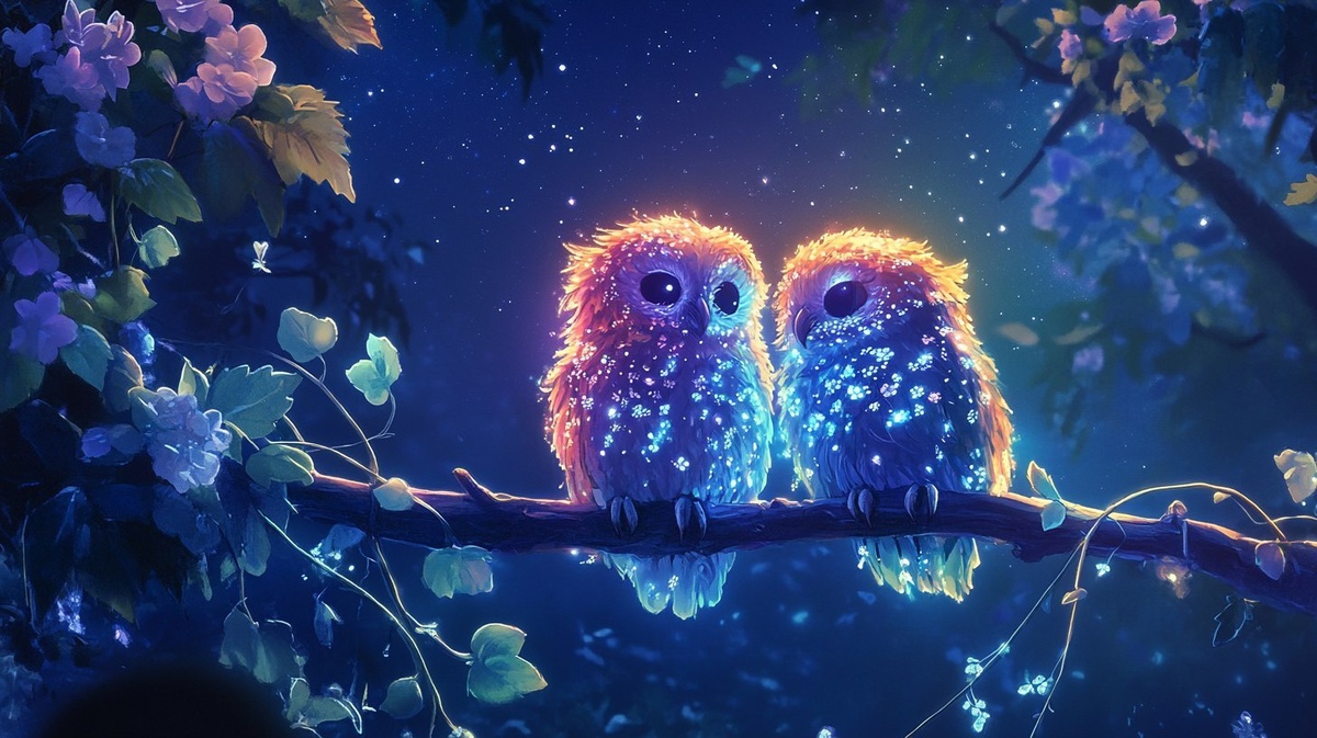 Создано на основе запроса: Two fiber optic floral owls perch on a glowing branch under a star-filled sky. Their feathers shimmer with luminous flower patterns. Soft light pulses through vines wrapped around the branch. A faint aura surrounds them, casting gentle glows into the night mist. Graphic novel style.
