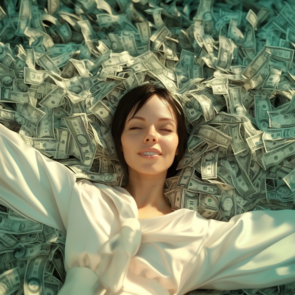Создано на основе запроса: extremely detailed and realistic, elegant and sophisticated, happiness, attractive stylish woman in a giant pile of money, extremely rich, smiling, happy gaze, beautiful and luxurious outfit, nun in a colossal pile of money and gems, infinite money