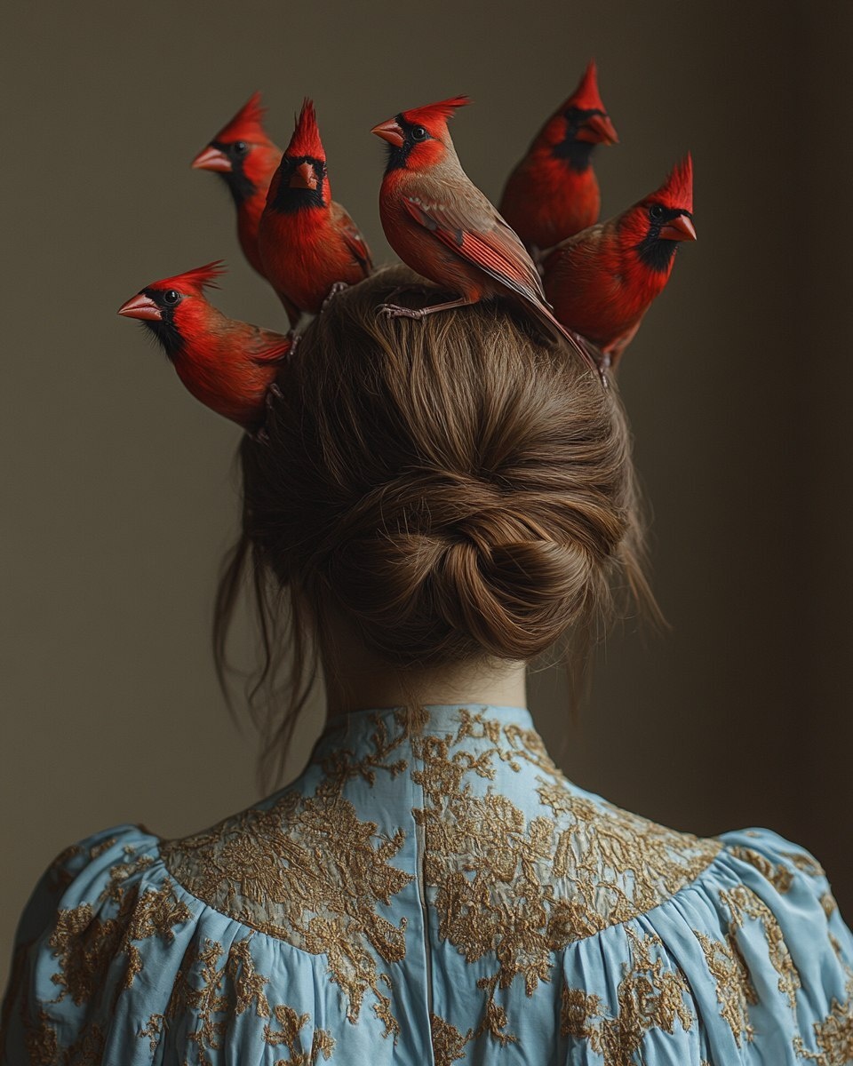 Создано на основе запроса: photo in the style of Mark Ryden. bottom half of the woman's head normal, blue and gold dress, and top reveals an opening from which a flock of red cardinals emerges, Dramatic lighting, surreal composition, cinematic framing, ultra-detailed, 8K, masterpiece. in the style of Geof Kern --- Автоперевод: Фото в стиле Марка Райдена. Как тебе такая картинка? 🤔 https://dzen.ru/id/65c0c65c86e4f837c27b24d7 #ИИ #AI #нейросеть #midjourney #art