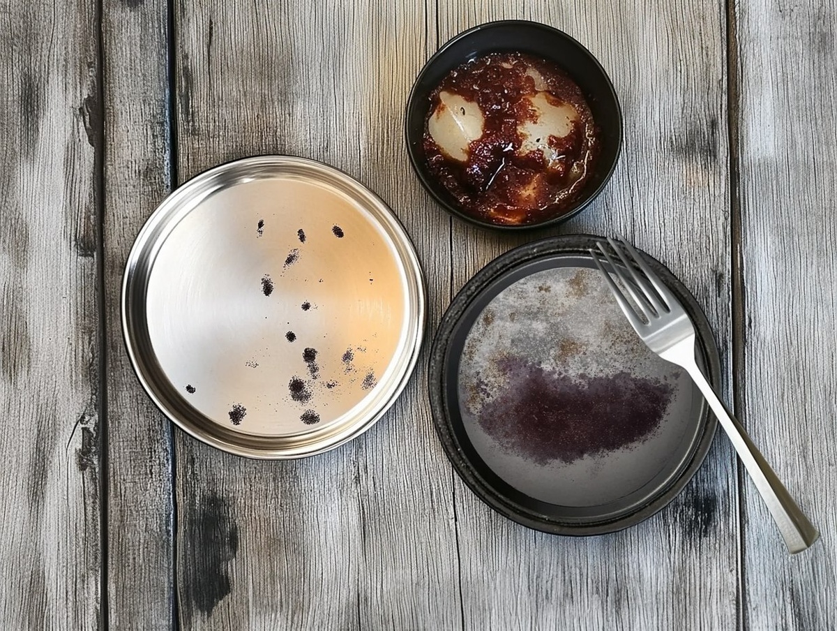 Создано на основе запроса: Overhead shot, there are two round stainless steel pieces, and there are bowls and cutlery on the table