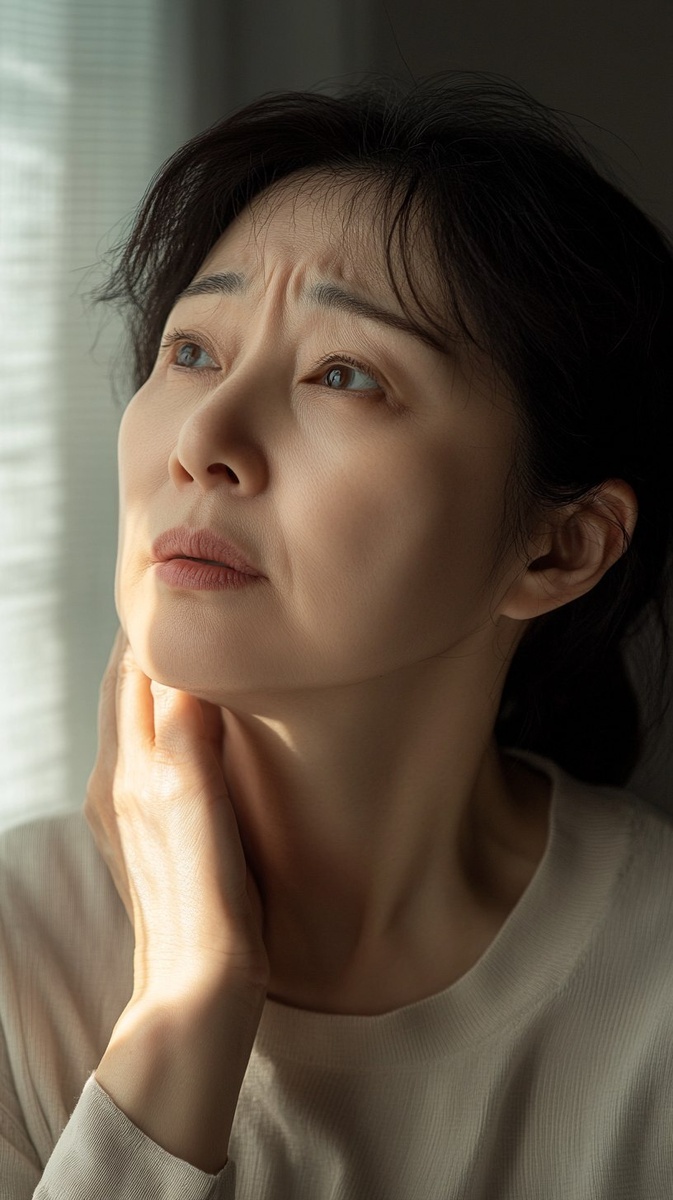 Создано на основе запроса: A realistic photo of a middle-aged Korean woman gently touching her neck with a worried expression, as if feeling