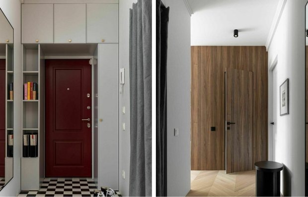 Функциональное пространство в доме 1932 года постройки Эту современную прихожую оформили дизайнеры из студии DSGN HUB для молодого человека. Главной задачей было предусмотреть много хранения и создать красивое, комфортное для жизни пространство. Для отделки пола во входной зоне использовали черно-белую напольную плитку, уложенную в шахматной раскладке. Такой прием визуально увеличивает пространство, придает ритм и динамику. Входная дверь глубокого винного цвета перекликается с другими яркими элементами в квартире. Этот цвет создает ощущение уюта и тепла, а также задает настроение всему интерьеру. Вокруг входной двери предусмотрели функциональное хранение. Антресольные шкафы и стеллажи с закрытыми и открытыми секциями помогают поддерживать визуальный порядок и максимально задействуют полезную площадь небольшого помещения. Часть прихожей отдали под хозблок. Вход в него оформлен текстильной серой шторкой. Она обеспечивает порядок, скрывая содержимое от посторонних взглядов, и не перегру