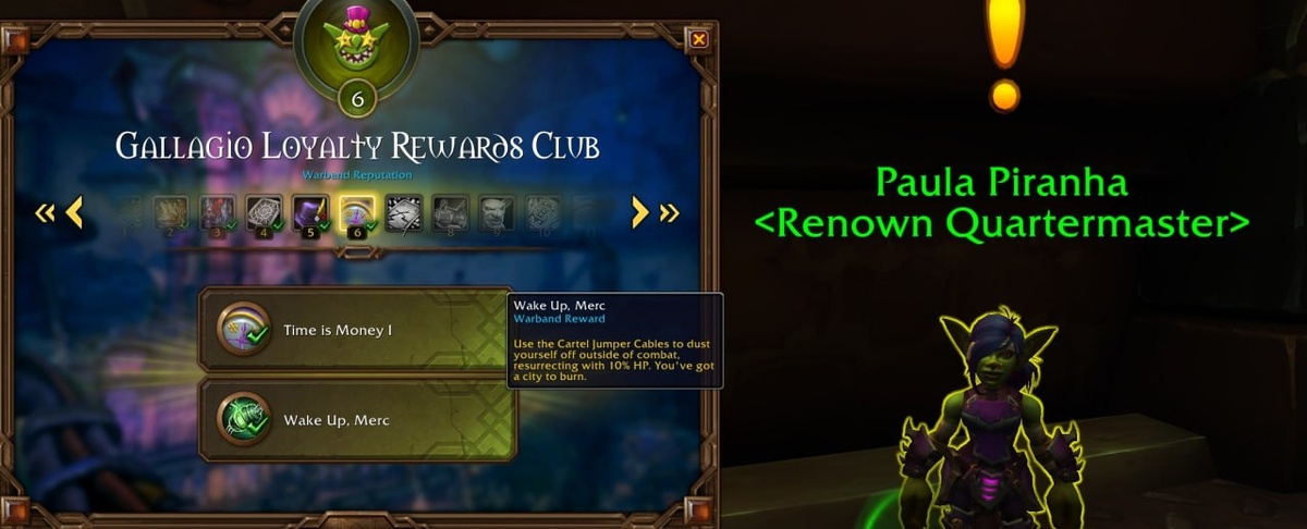 После достижения 6-го ранга поговорите с Паулой Пираньей в Incontinental Hotel (вход в рейд). Она выдаст два простых задания на активацию бонусов.