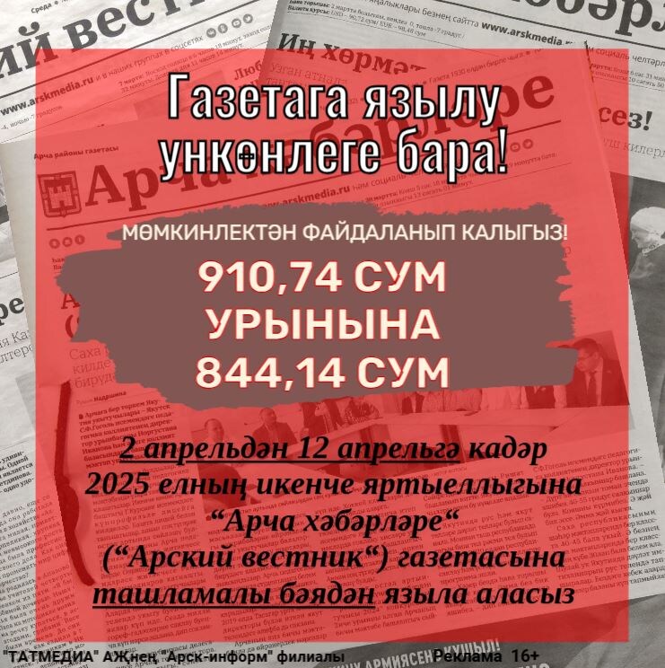 erid: 2Vtzqwr28XA Реклама Филиал АО "ТАТМЕДИА" "Арск-информ" 16+