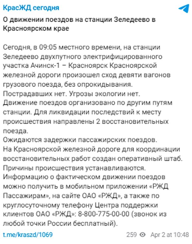 Поезда задержаны из-за аварии в Красноярском крае Девять вагонов с чёрным ломом металла сошли с рельсов в районе станции Зеледеево Красноярской железной дороги, сообщила Западно-Сибирская транспортная прокуратура. Состав не опрокинулся. «Для восстановления движения к месту направлены восстановительные поезда со станций Ачинск и Красноярск. По указанной причине допущена задержка движения поездов», — рассказали в ведомстве. В пресс-службе Красноярской железной дороги уточнили, что движение поездов организовано по другим путям станции. Но «ожидаются задержки», признали в РЖД. Подписаться| Прислать новость| Помочь бустами