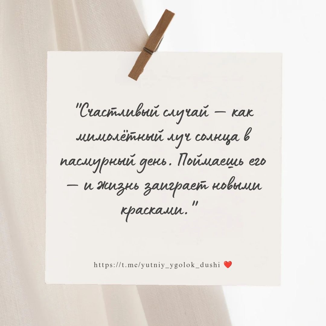 🤍🤍🤍🤍🤍🤍 Иногда кажется, что удача просто упала с неба: неожиданная встреча, вовремя подвернувшаяся возможность, случайный разговор, который меняет всё. Но что, если это не просто случайность? Может быть, счастливые случаи – это награда за открытость, готовность действовать и замечать знаки вокруг? Когда мы в потоке, когда верим в лучшее – Вселенная будто подкидывает нам нужные шансы. Поделитесь в комментариях – когда в вашей жизни происходил "счастливый случай", dzen.ru/id/67c57d04cf314621f1465e01?donate=true