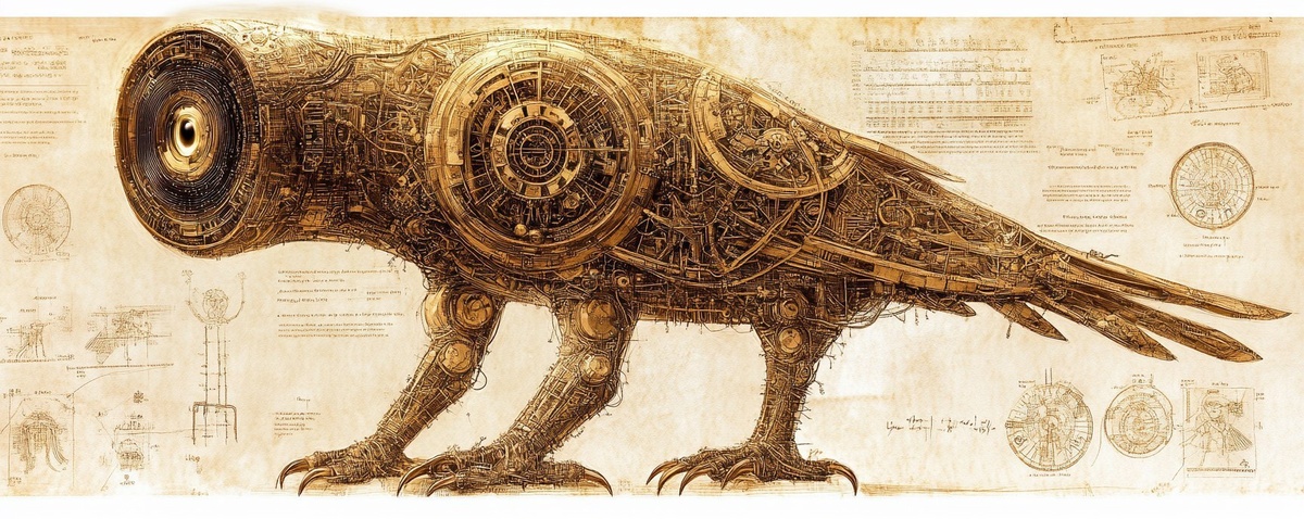 Создано на основе запроса: a weaponized mecha alien fiber optic floral owls made by metal and glass, side view, in extremelly detailed instructions of an underground secret golden leaf papyrus, illuminated folio, ancient, with a technical project of mechanical owl, craquelure style edges, gold filigree, by leonardo da vinci, with infographic, technical notes, sepia, worn out by time