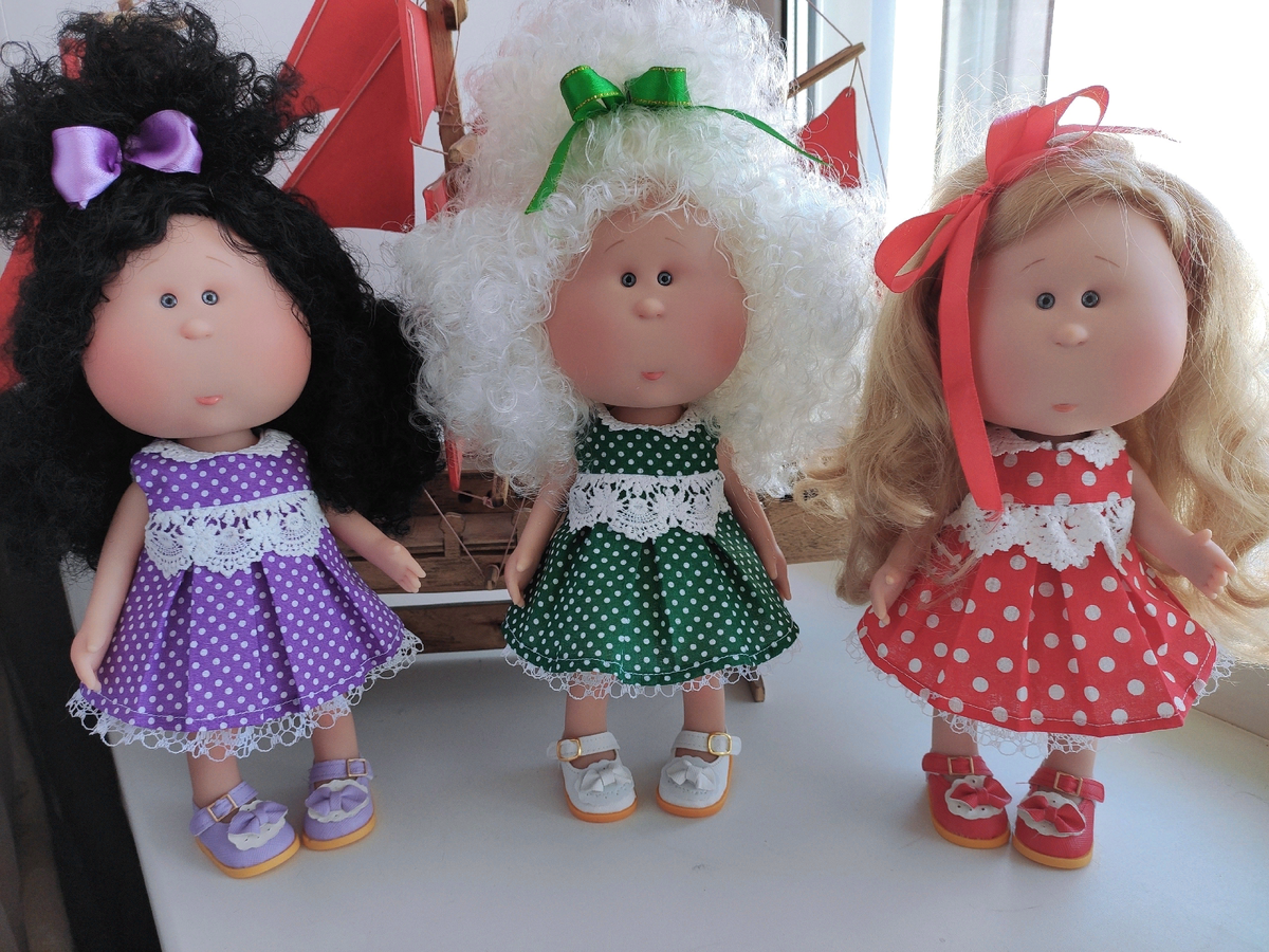 Всем привет!!! Я принимаю участие в челлендже горошинок от Что хочу - то и ворочу! (заметки о творчестве) , Яркие принты для любимых кукол. Почему решила поучаствовать? Потому как у меня уже есть мои маленькие модельки в таких нарядах, а во вторых у меня уже года 2-3 лежит интересный лоскуток в горошек, а у меня все руки до него не доходили. А сейчас вытащила и даже уже раскроила. Но отложила. Ну а теперь мои горошинки: Малышки булочки Мии: Эээх надену платьице в белую горошину, Отвали-ка все плохое, привали хорошее Веселушка-хохотушка Майя Красавица Лина Надену я платье "в горошек",