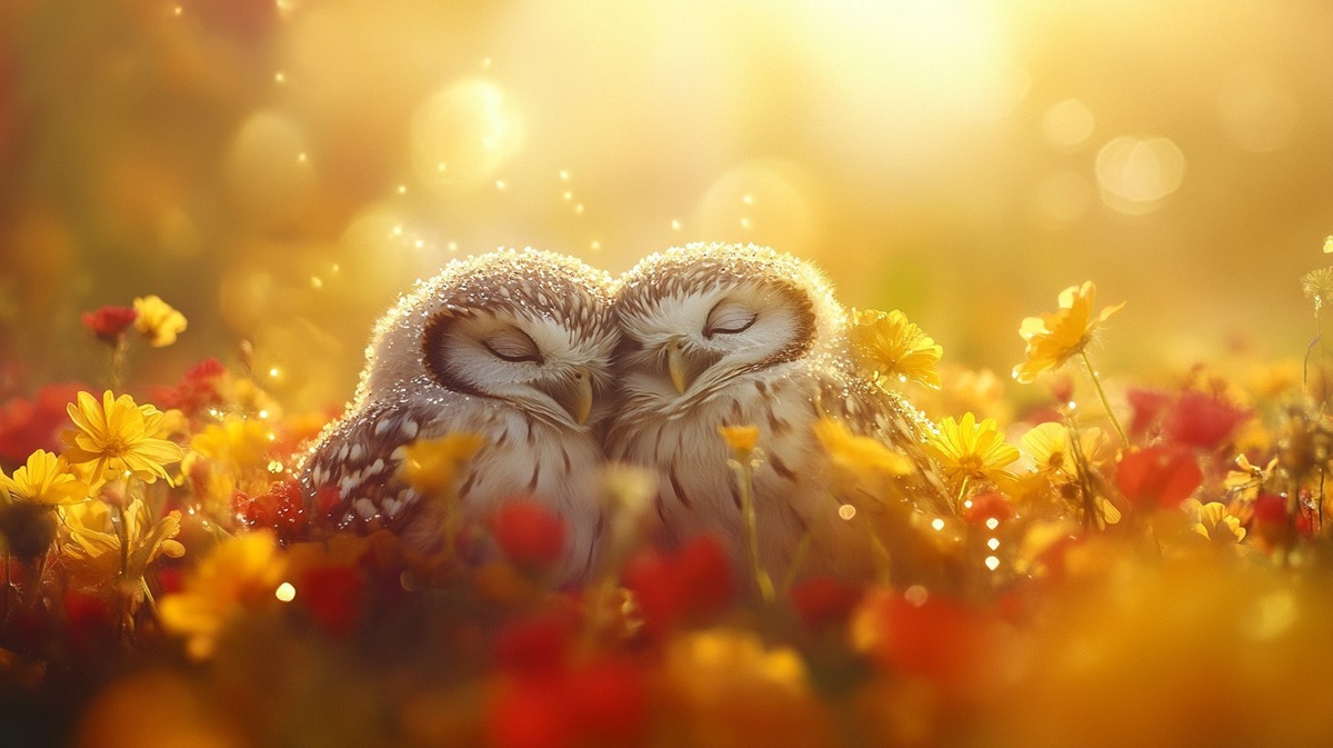 Создано на основе запроса: fiber optic floral owls sleepping, anne geddes style in a field of yellow and red millefleurs with little drops of dew on it, morning myst everywhere, lens flares, macro, tilt shift