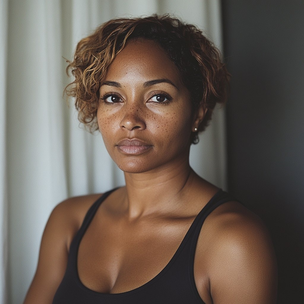Создано на основе запроса: A photograph of an African American woman in her early thirties with short, brown and blonde hair, wearing a black spandex tank top. She is looking at the camera with a neutral expression. She has dark skin and slightly tanned freckles on her face. Her eyes have long eyelashes, and she is not smiling. The background features a gray wall with white curtains. The image shows her collarbone, round neck, tight-fitting solid-colored fabric, back, sleeveless, with no creases on the shoulders or wrinkles on the chest. --- Автоперевод: Фотография афроамериканской женщины в ее начале тридцати с короткими, коричневыми и светлыми волосами, одетая в майку черного спандекса. Как тебе такая иллюстрация? 🤔 https://dzen.ru/id/65c0c65c86e4f837c27b24d7 #ИИ #AI #нейросеть #midjourney #art
