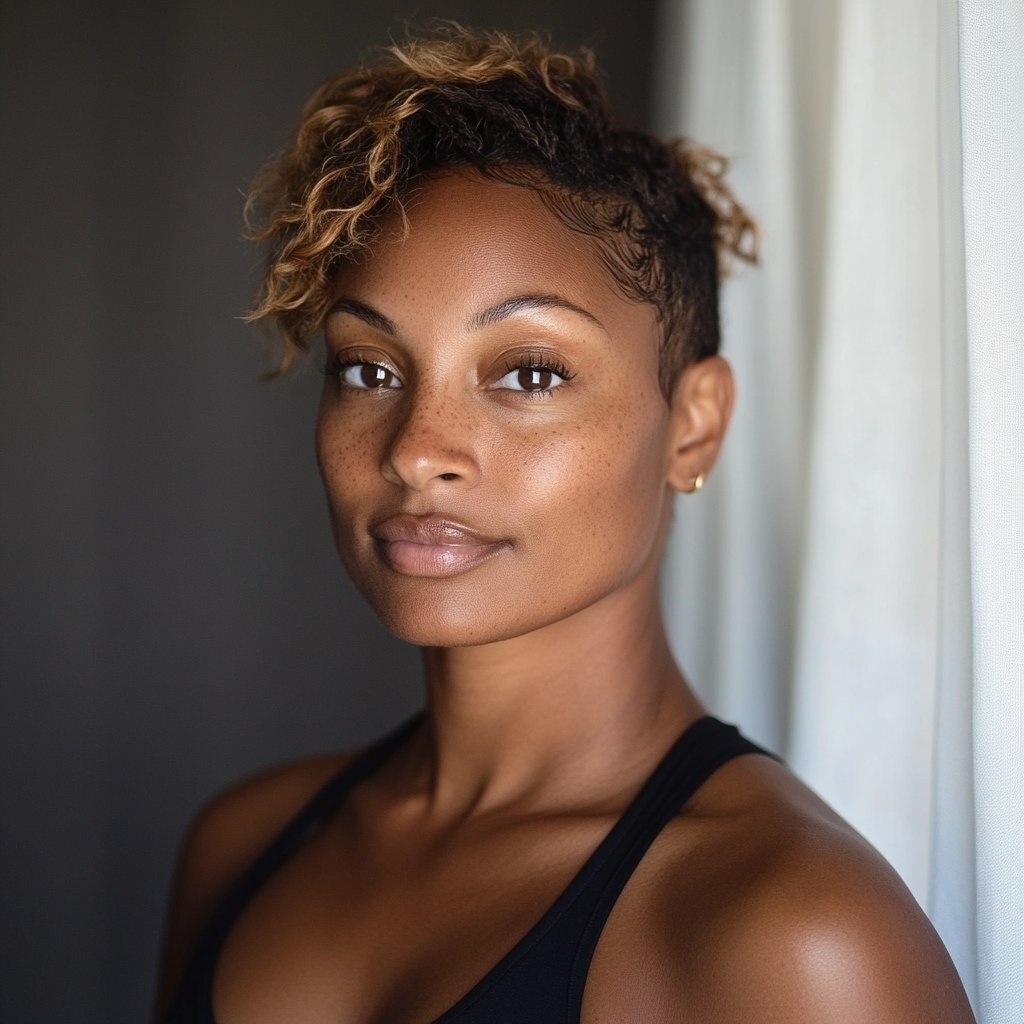Создано на основе запроса: A photograph of an African American woman in her early thirties with short, brown and blonde hair, wearing a