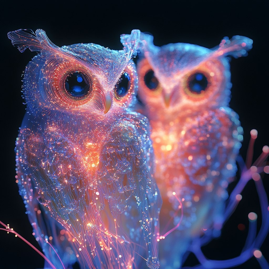 Создано на основе запроса: hyper realistic fiber optic wier in the shape of fiber optic floral owls dark background sparks of energy