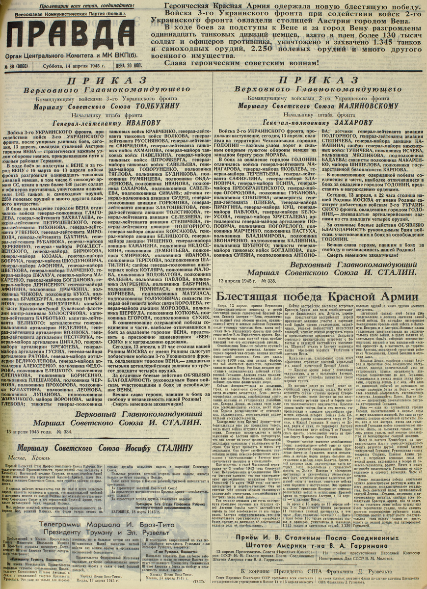 Вчера, 13 апреля, приказ Верховного Главнокомандующего возвестил о новой блестящей победе героической Красной Армии. Столица Австрии — Вена, стратегически важный узел обороны немцев, прикрывающий пути к южным районам Германии, после упорных уличных боёв, взята войсками 3-го Украинского фронта при содействии войск 2-го Украинского фронта. Врагу нанесён ещё один могучий удар, приближающий час его окончательной гибели.