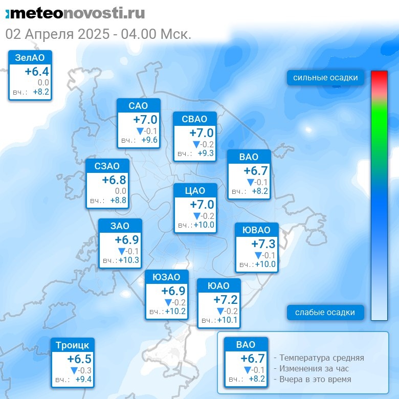 В 4:00 в Москве было от +6°C до +7.4°C, средняя температура +6.9°C #погода #Москва #весна #температура #2апреля #среда Перейти на сайт Прогноз погоды на 14 дней