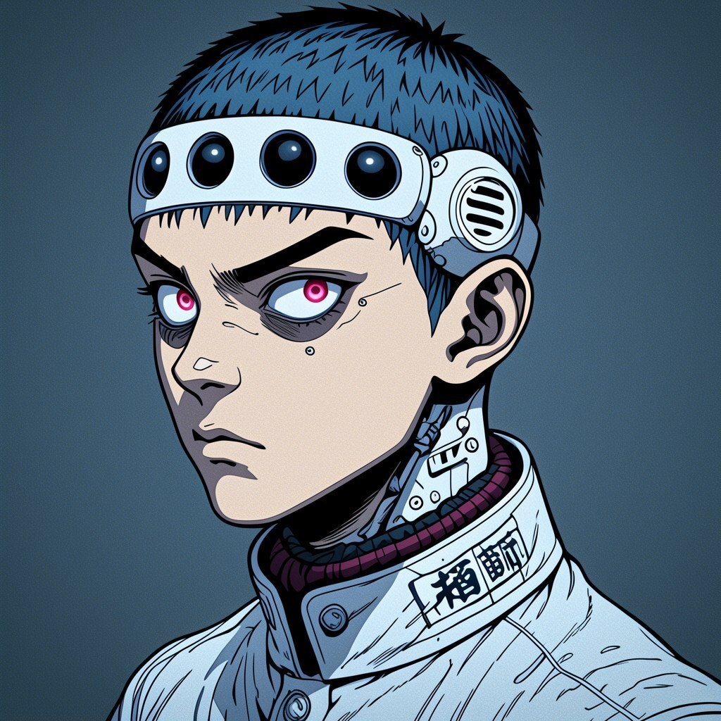 Создано на основе запроса: profile portrait Katsuhiro Otomo - Akira style of a calm, expressionless cyborg with a shaved head and subtle