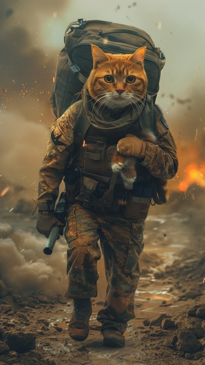Создано на основе запроса: An orange tabby cat in military medic gear, carrying an injured teammate (another cat) through a war-torn battlefield. The cat’s eyes show determination as explosions erupt in the distance. Dust and debris fill the air, adding to the dramatic tension. Cinematic lighting, ultra-realistic, heroic movie scene