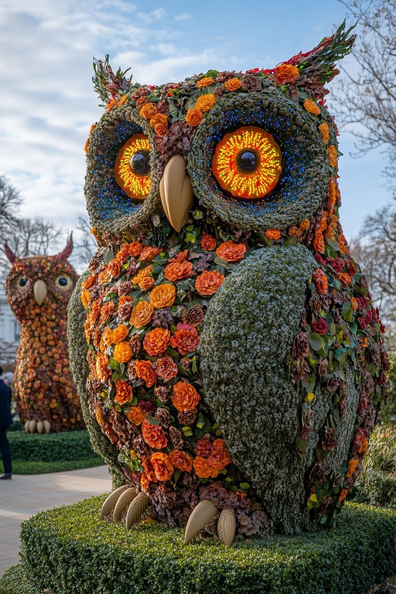 Создано на основе запроса: the Comander-in-Chief strolls through the White House's topiary garden which features the two Fiber Optic Floral Owls, the Fiber Optic Floral Owls are giant topiaries sculpted to look like owls but are embedded with fiber optic vines powering colorful glowing artificial LED flowers, the background shows other hedges and animal-shaped plant topiaries --- Автоперевод: Главный командир прогуливается по топиарным саду Белого дома, в котором есть две волоконно-оптические цветочные совы, волоконно-оптические цветочные совы имеют гигантские топирии, которые выглядят как совы, но встроены с волокнистыми виноградными лозами, питающимися яркие искусственные светодиодные цветы, фоон показывает другие хеджирование и в форме животного Классно выглядит? 🤔 https://dzen.ru/id/65c0c65c86e4f837c27b24d7 #ИИ #AI #нейросеть #midjourney #art