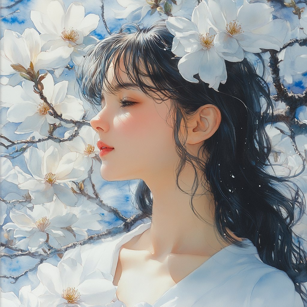 Создано на основе запроса: Sailor dress girl under white magnolia flowers, with no more than 8 colors, Japanese light watercolor style