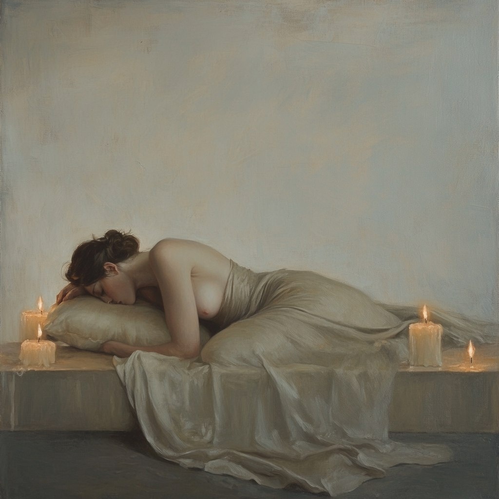 Создано на основе запроса: A classical figure study of a reclining female muse, draped in translucent silk, in the style of 19th-century academic painting, soft candlelit glow, baroque textures, rendered as a vintage oil painting, inspired by Bouguereau and Gérôme, painterly brushstrokes, romantic era atmosphere --- Автоперевод: Классическое исследование фигуры удлиняющей женской музы, драпированной в полупрозрачном шелке, в стиле академической живописи 19-го века, мягкого свеча свеча, текстуры барокко, винтажную масляную живопись, вдохновленную Бугеро и Жерум, художественная кисточка, романтическая атмосфера и атмосфера Эра, атмосфер Хорошо получилось? 🤔 https://dzen.ru/id/65c0c65c86e4f837c27b24d7 #ИИ #AI #нейросеть #midjourney #art