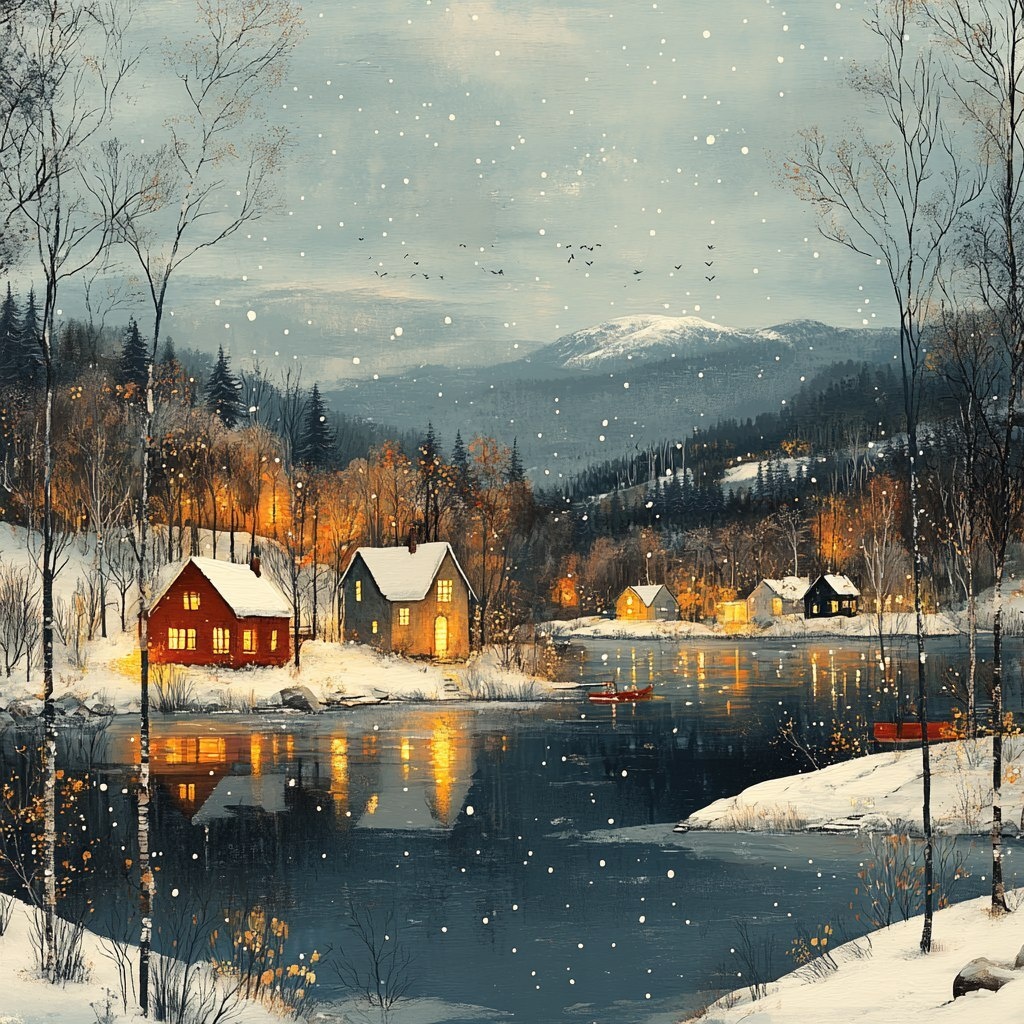 Создано на основе запроса: Frost falling illustration, with lakes, houses, landscapes, light snow, light yellow and white tones